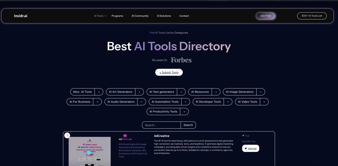 The platform features an extensive lists over 500 AI tools across 78+ categories. Detailed tool reviews are also available. Its established AI directory brand has gained recognition, with mentions in prominent publications and contributions to projects for governmental entities.