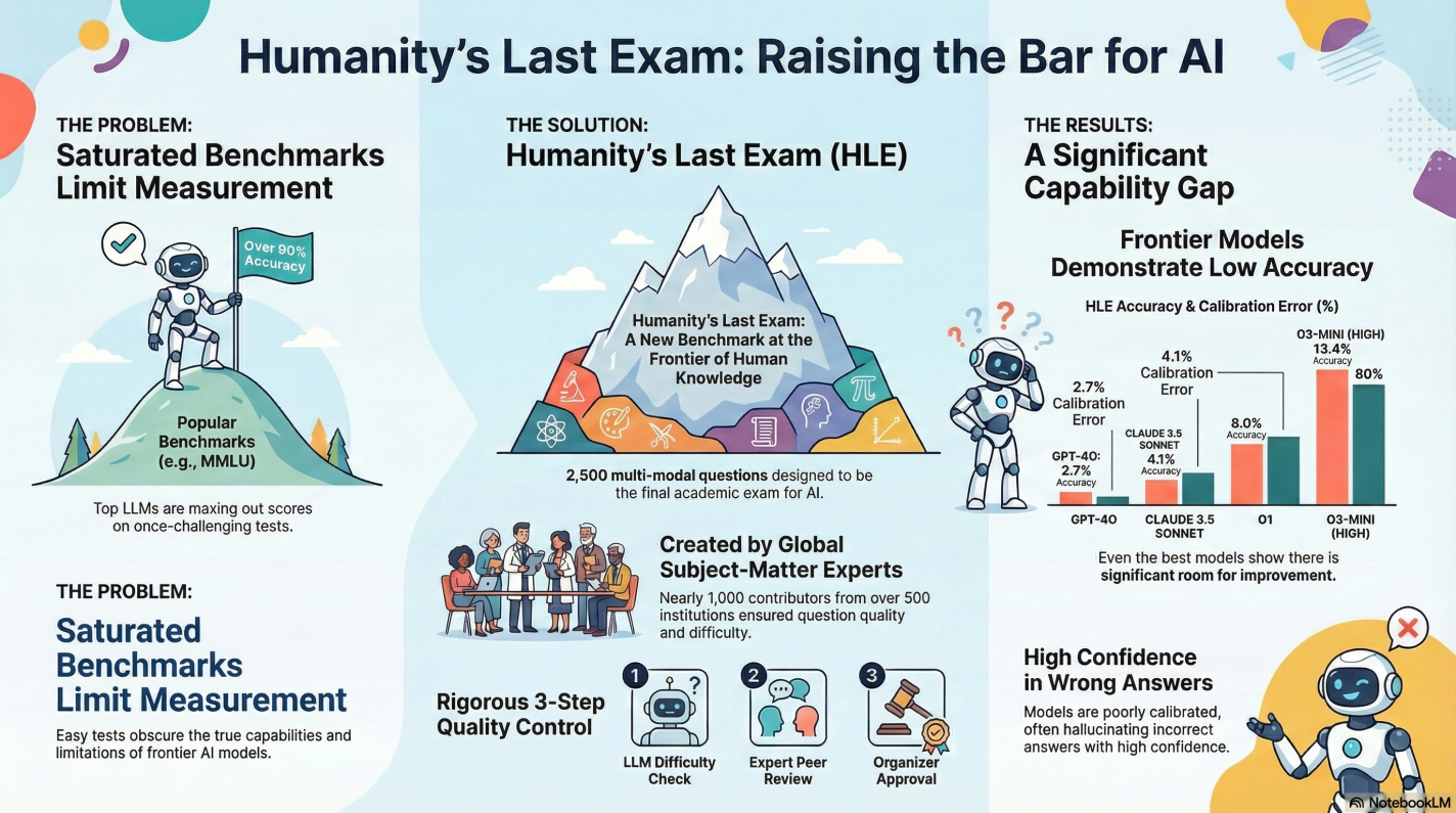 Are we really looking at Humanity’s Last Exam for language models? LLMs and AI have advanced, now exceeding LLM performance across a diverse range of tasks in many fields. However, state-of-the-art LLMs are now exceeding these popular benchmarks, achieving over 90% accuracy. Accurately measuring current AI LLM capabilities requires creating more challenging LLM evaluations to track the rapid improvements in LLM technology. The case study, Humanity’s Last Exam, provides several interesting discoveries regarding the current state and limitations of state-of-the-art Large Language Models when tested on cutting-edge technology.